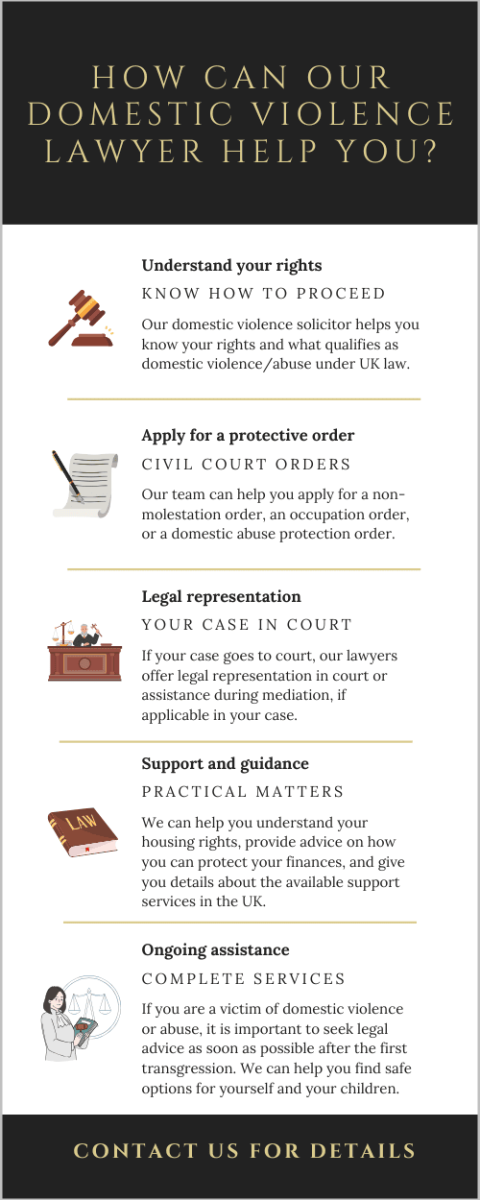 Given the fact that domestic abuse is an umbrella term and that victims may ask for aid for more than one form of abuse, seeking legal assistance, such as that offered by our family law solicitors in London, is a key step.